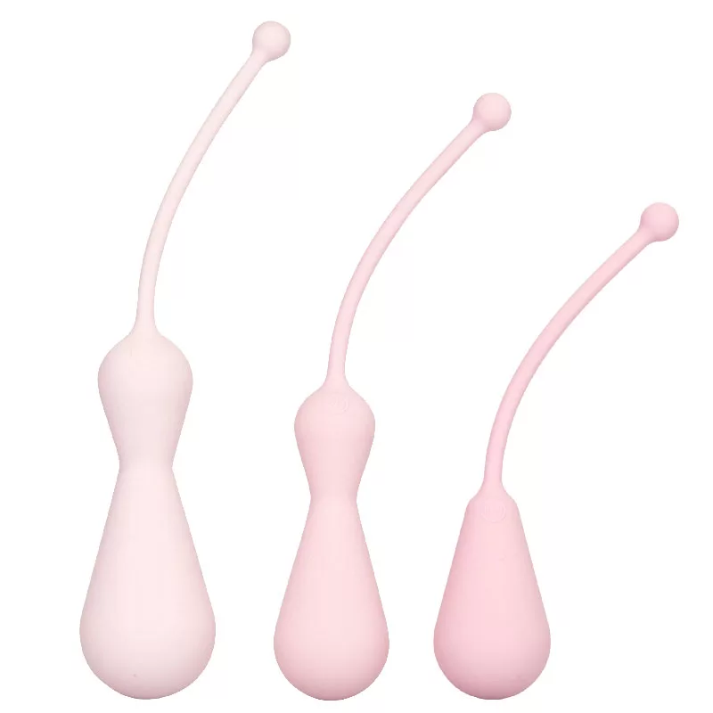 To help strengthen and revitalize pelvic muscles this 3-piece Kegel training set is made out of silicone with easy retrieval cords.